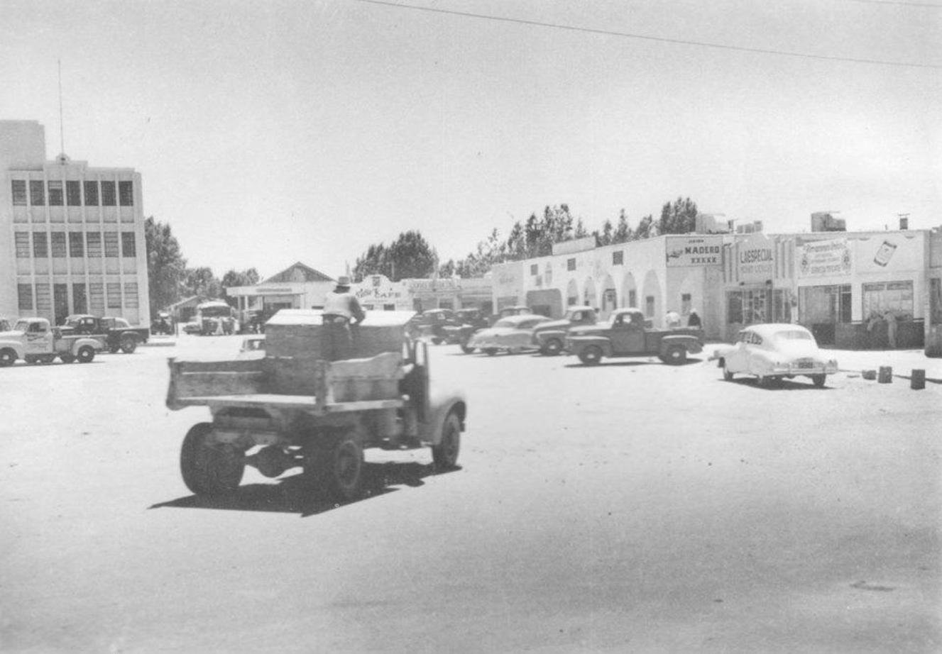 Destacando en primer plano, un imponente camión de volteo, de la decada de los 40s, testimonia la vitalidad de la industria local en aquellos tiempos. Este vehículo, con su robustez y carácter, es símbolo del trabajo incansable que caracterizaba a la región en esa época.